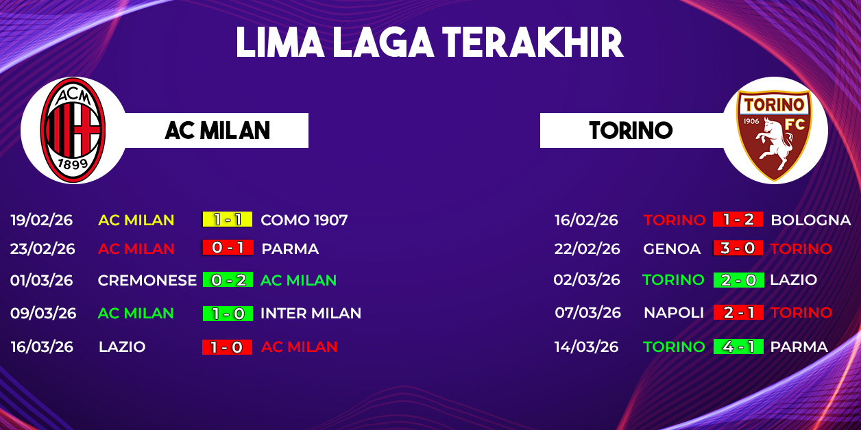 AC Milan tampil cukup konsisten dalam beberapa pekan terakhir dengan kombinasi permainan menyerang dan soliditas lini belakang. Sementara itu, Torino dikenal sebagai tim dengan pertahanan yang cukup disiplin dan sering merepotkan tim besar dengan skema counter attack yang cepat.