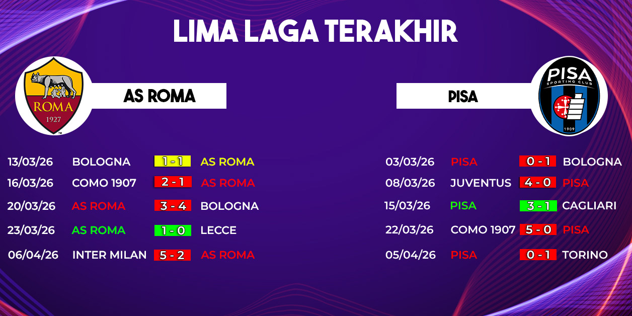 AS Roma datang dengan kepercayaan diri tinggi setelah serangkaian hasil positif dalam beberapa pekan terakhir. Sementara itu, Pisa mencoba tampil konsisten dan mencuri poin penting demi memperbaiki posisi klasemen. Laga ini diprediksi berjalan intens sejak menit awal dengan tekanan tinggi dari kedua tim.