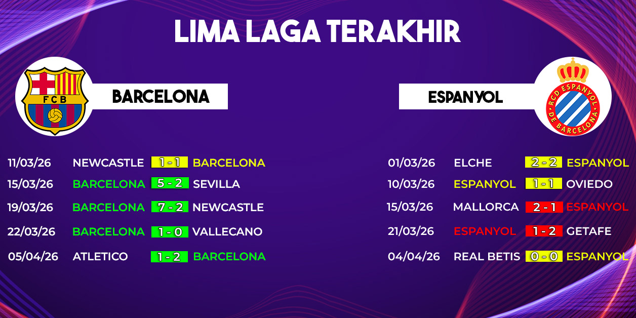 Pertandingan panas akan tersaji dalam lanjutan La Liga saat FC Barcelona menghadapi rival sekota mereka, RCD Espanyol, pada tanggal 11 April 2026. Duel Barcelona vs Espanyol yang bertajuk Derbi Catalan ini selalu menghadirkan tensi tinggi, emosi, dan kualitas permainan yang tidak bisa diremehkan.